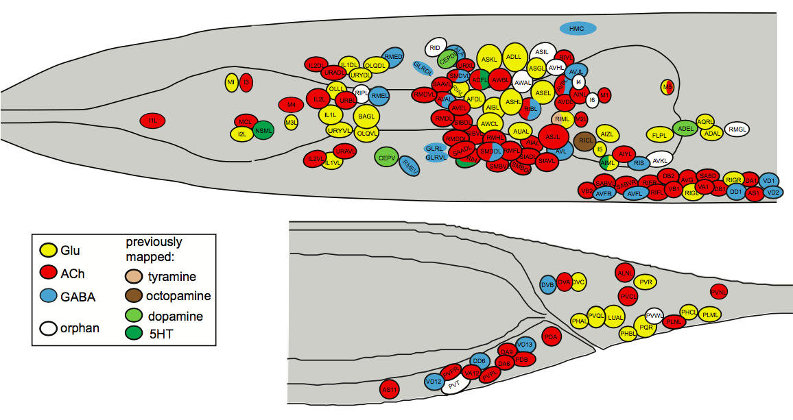 Figure 1 legend: Neurotransmitter map covering >90% of all neurons in the C.elegans nervous system.